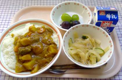 デザートは今が旬のぶどうです。むらさき色が「巨峰」、きみどり色が「シャインマスカット」です。巨峰の特徴は、大きな粒と甘さで、ぶどうの王様と呼ばれるほど人気のある品種です。シャインマスカットの特徴は、種が無く皮ごと食べられて、甘くて香りがよいところです。今日はどちらも山梨県で収穫されたぶどうです。食べくらべてみて、2つのぶどうの味の違いを感じられました。