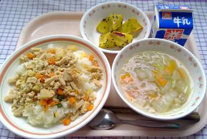 9月25日(水)きゅうしょく 公開日 2024/09/25 更新日 2024/09/25 給食日記 今日のこんだて ・高野豆腐のそぼろ丼 ・白菜スープ ・大学いも ・牛乳 大学いもとは、さつまいもを油で揚げて、甘い蜜をからめた料理です。給食ではざらめ糖、水あめ、しょうゆを煮詰めて蜜も手作りしました。もともとは中国の蜜濺紅芋(ミーチェンホンシュー)という料理が起源です。