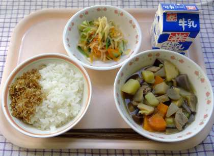 かみかみふりかけは大人気のメニューです。ちりめんじゃこ・かつお節・白ごまを使ったシンプルなふりかけですが、残菜はほとんど無くたくさん食べてくれました。