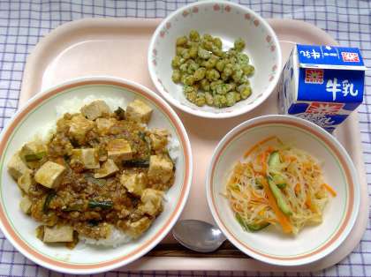 10月16日(水)きゅうしょく 公開日 2024/10/18 更新日 2024/10/18 給食日記 今日のこんだて ・マーボー丼 ・パンサンスー ・大豆しゃりしゃり ・牛乳 大豆しゃりしゃりは、乾燥大豆を茹でてかたくり粉を付け、油で揚げたものに青のりをまぶして作りました。カリッとしていて食べやすく、大人気のメニューです。