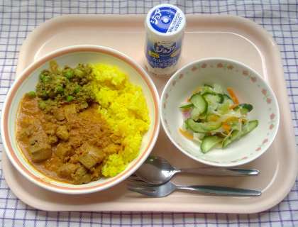 インド料理、バターチキンカレーです。スパイスを効かせ本格的に仕上げました。今日は服部栄養専門学校からシェフが来て、4年生が給食を食べている様子を取材しました。美味しいと言って食べる姿を見て、シェフも喜んでいました♪