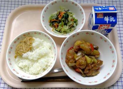 鉄骨サラダには、鉄分を多くふくむ『ひじき』や『ごま』、カルシウムを多くふくむ『小松菜』や『ちりめんじゃこ』が入っています。みなさんの成長に必要な栄養素がたくさんつまったサラダです。