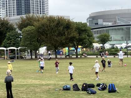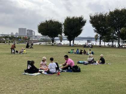 豊洲公園でお弁当。食後は鬼ごっこが始まりました。
