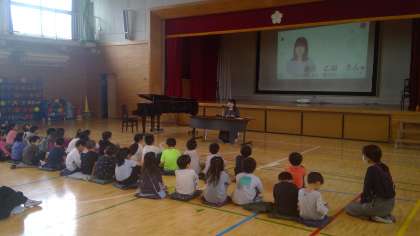 🎹ショパンの「子犬のワルツ」の演奏から始まり、朝起きてからの身支度、食事の準備をどのように工夫しているか、外に出掛ける時に使っている白杖の使い方、文字の読み書きをどのようにしているかなどのお話を聞きました。そして最後にディズニー映画「アラジン」より「ホール・ニュー・ワールド」を演奏していただきました。子供たちからはたくさんの質問があがり、大いに興味を示していました。