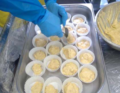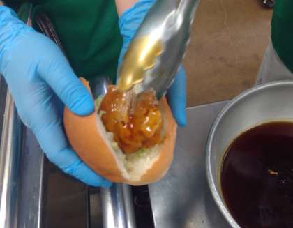 照り焼きチキンサンドは、パンに茹でキャベツと照り焼きチキンを挟んで作りました。3人で約300個、パンに切れ目を入れ、キャベツを挟み、チキンを挟む作業をしました。