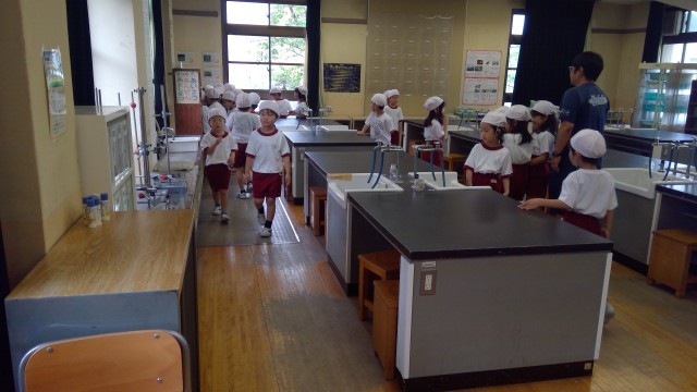 理科室では、メダカや実験道具、骨格標本など、子どもたちの好奇心を刺激するものがたくさんありました。