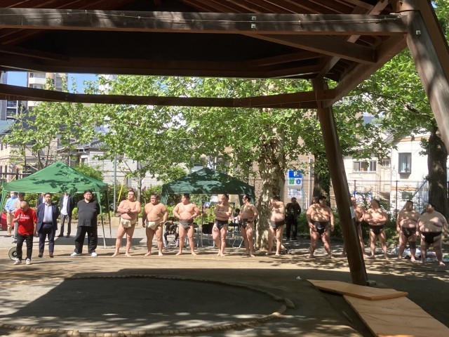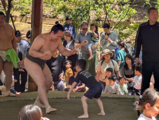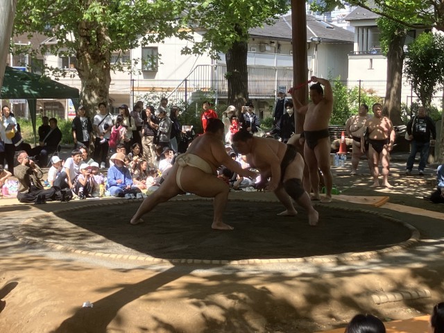 4月27日(日)9時から、氷川の杜公園相撲場で木瀬部屋の力士による、大相撲朝稽古が行われました。本物の力士の稽古は迫力満点!力士の稽古の後は子供たちとのふれあい相撲が行われ、たくさんの子供たちが力士に挑戦しました。