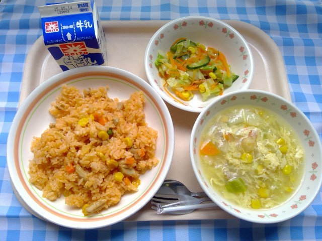 5月8日(木)きゅうしょく 公開日 2025/05/08 更新日 2025/05/08 給食日記 今日のこんだて・チキンライス・ひよこ豆と卵のスープ・キャロットサラダ・牛乳今日の給食は色鮮やかなチキンライスがメインでした。洋食の日は皆もりもりお代わりをしてくれるので、残菜が少なくてうれしいです。