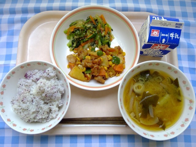 6月18日(水)きゅうしょく 公開日 2025/06/18 更新日 2025/06/18 給食日記 今日のこんだて・ゆかりご飯・鶏とコーンの揚げ煮・糸寒天のゴマ酢和え・みそ汁・牛乳ゆかりは、赤いシソの葉を乾燥させ、細かく刻んでふりかけにしたものです。紫色がゆかりの色とよばれていたことが由来だそうです。ゆかりご飯は好きな人も多く、よく食べていました。
