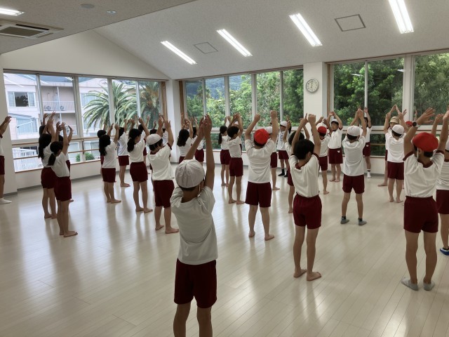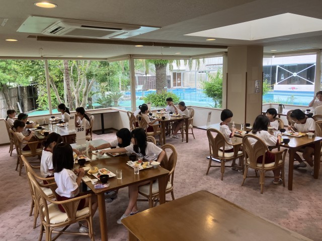 2日目の朝です。体調不良者もなくみんな元気にスタートしました。ラジオ体操をして、朝食をしっかりと食べたら、今井浜に向かいます!
