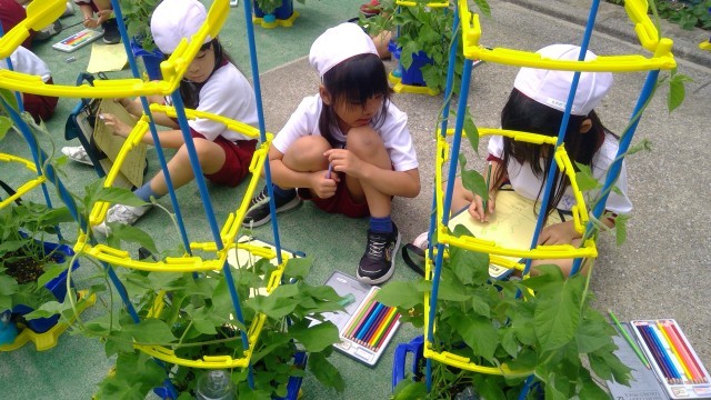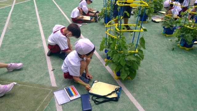 少しずつ成長していくあさがおに、みんな興味津々です。次は花の観察を予定しています。