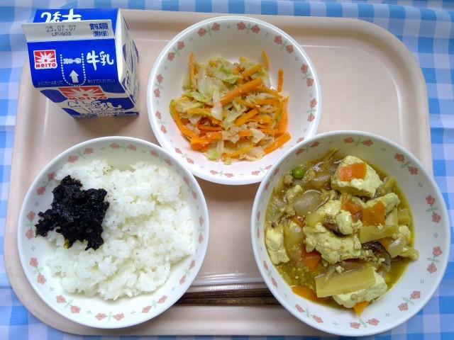 ご飯がぱくぱく進むのりの佃煮は、どの学年でも大人気でした!のり、ひじき、あおさを醤油、みりん、砂糖、かつおだしでよく煮詰めた佃煮ですが、ひじきが入っていることには気づかずに食べてくれていました。また、にんじんサラダのドレッシングにはみじん切りのらっきょう甘酢漬けを使っています。夏の疲れで減りがちな食欲を刺激してくれるいい酸味でした。
