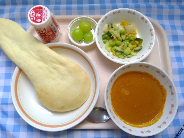 今日のバターチキンカレーは、カレー粉を使わずに作ったカレーです。バターと生クリーム、トマトピューレをベースにパプリカ粉、ターメリック、クミン等のスパイスを合わせました。写真では沈んでしまいましたが、シナモンとヨーグルトに漬け込んだ鶏肉もゴロゴロ入っています。辛さがまったくないカレーなので、どの学年も残さず食べてくれました!お皿からはみ出るくらい大きなナンも、目を輝かせて食べていました。
