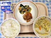 今日のこんだて・ご飯・マーボーじゃが・ナムル・グレープゼリー・牛乳今日は給食で人...