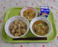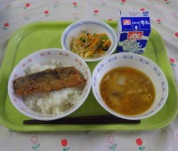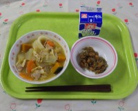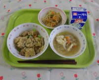 五目ご飯たくあんのおかか和え塩ちゃんこ汁牛乳
