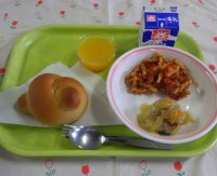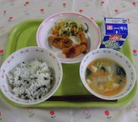 わかめご飯ミックスフライ(エビ&ぶた)野菜の塩こぶ和え味噌汁牛乳