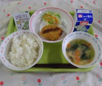 ご飯(のりなっとうふりかけ)コロッケボイルキャベツ味噌汁牛乳