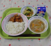 ご飯鶏肉のチリソースわかめサラダビーフンスープ牛乳