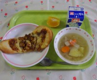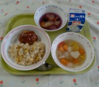 おみくじハンバーグ丼野菜スープサイダー入りフルーツポンチ牛乳