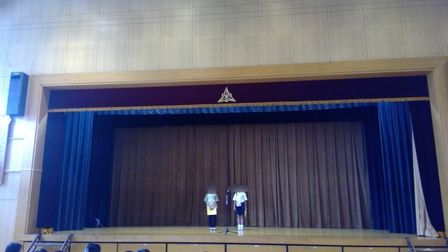 全校児童の前で発表をしました。緊張した様子でしたが、