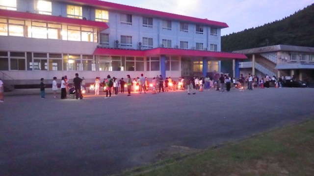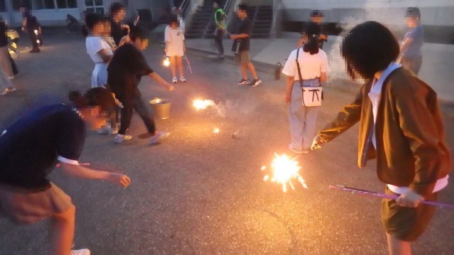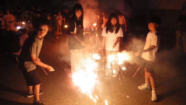 その後、金山小学校のPTAの方々と猿楽会の方々などの金山姉妹校交流を支えてくださっている方たちが、花火を準備していただきました。手持ち花火と打ち上げ花火で、おもてなしをしていただきました。金山小学校の子供たちと猿楽小学校の子供たちの交流をさらに深めることが出来ました。