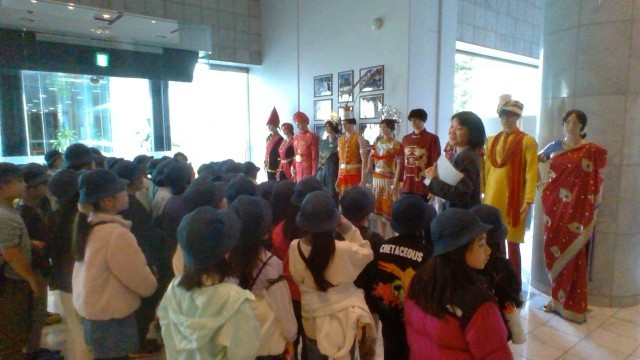 大使館ではマレーシアの伝統的な衣装や、料理、自然などについて映像を見ながら説明を聞き、質問タイムではたくさんの子供たちの質問に一つ一つ丁寧に答えていただきました。