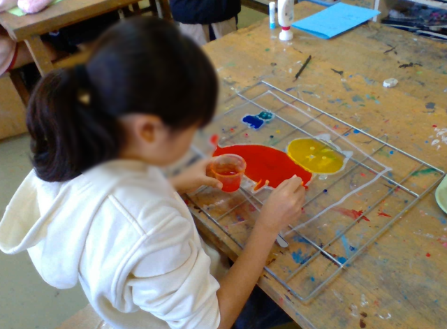 透明感のある絵の具に「わ〜きれい!」と、色を入れるのも楽しんでいました。