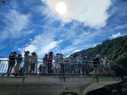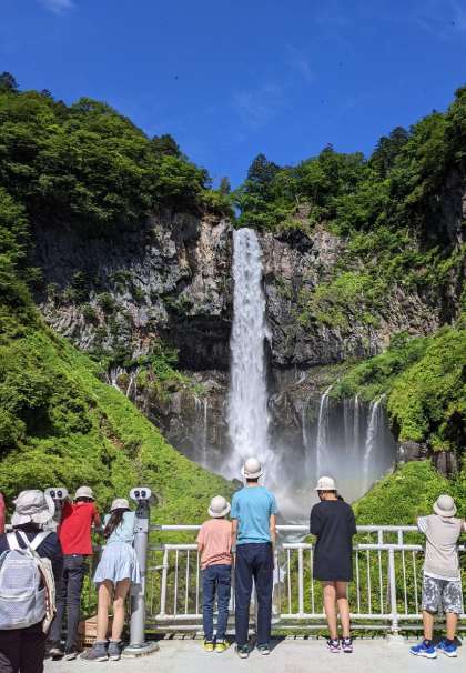 青空の中、水量の多い「華厳の滝」を見ることができました。