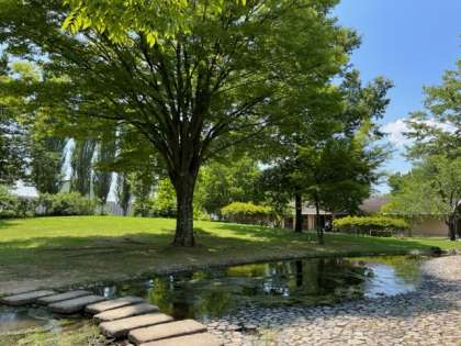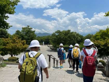 水辺のある公園で美味しくお弁当をいただき、これから宿舎へ向かうところです。みんな元気いっぱい、お腹いっぱいです。