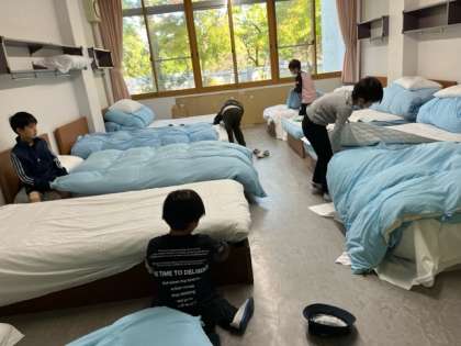 避難訓練を終えて、ベッドメーキングも頑張っています。