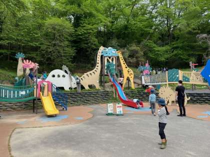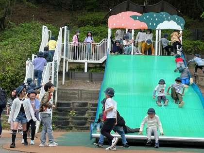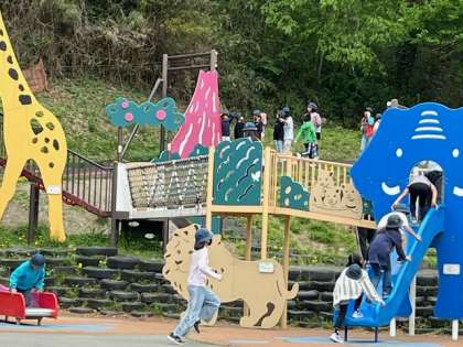 おやつタイムの後は楽しい遊具の広場で遊びます。人気はみんなで滑れる大すべり台とターザンロープ。夢中に遊んでいます。