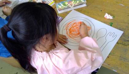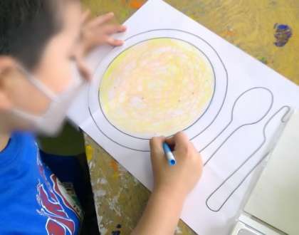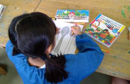 2年生は1年生で学習したクレパスやクーピーを使って、おいしいおすすめのスパゲッティーを絵に表しています。色を混ぜたり、お皿やスプーンの装飾を考えたりして、自分なりのスパゲッティーを制作中です。