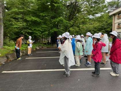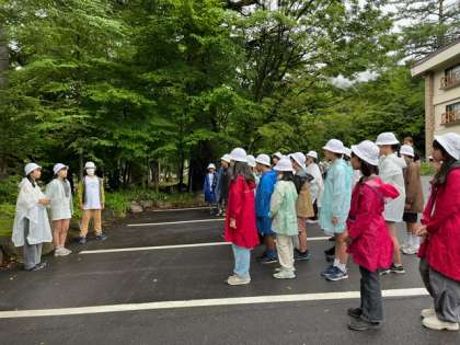 今朝は外で朝会ができました。そして、爽やかな朝の空気を吸い込みながら、緑の中を散策しました。