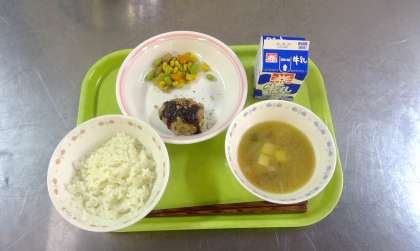 ご飯 お好みバーグ コロコロソテー 豆腐となめこの味噌汁 牛乳