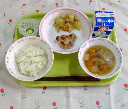 ご飯 鶏のゆず塩焼き 野菜炒め ソーキ汁 シークワーサーゼリー 牛乳