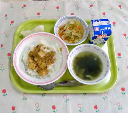 麻婆飯 タコサラダ わかめスープ 果物 牛乳