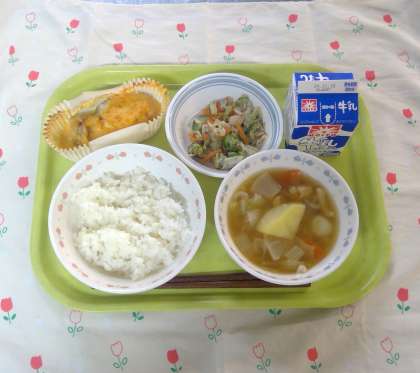ご飯 魚のもみじ焼き キャベツのゆかり和え 団子汁 牛乳