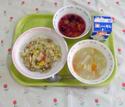 ジャンバラヤ マカロニスープ フルーツポンチ 牛乳