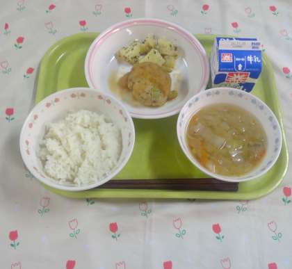 ご飯 大豆たっぷりハンバーグ じゃがいものバジル和え 味噌汁 牛乳