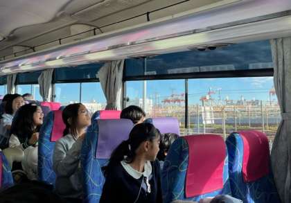 澄み渡る青空のもと社会科見学に出発しました。全員,元気に参加でバスも出発しました。バスの車窓からの景色も楽しんでいます。
