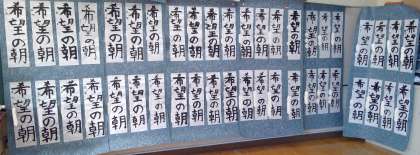 1月12日(火)書初め会 公開日 2021/01/15 更新日 2021/01/15 5年生日記 1・2時間目に書初め会を行いました。 44人分作品がそろいました。 たくさん練習した成果が見事に表れています。