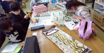 墨で書いた「なが〜い絵」に、絵の具で色をつけ完成しました。