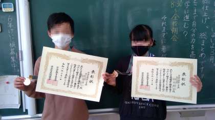 全校朝会の後、教室で校長先生から賞状とメダルをいただきました。
