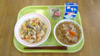 3月3日はひな祭りです。今日の給食は、ひな祭りにちなんだ献立でした。ちらし寿し、あぶらふの煮物、そしてさくら餅。彩鮮やかで、見ても食べても楽しめる給食でした。