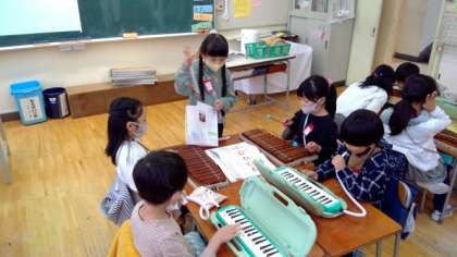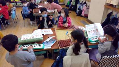 1年生の音楽で、トライアングルや木琴、鍵盤ハーモニカを使って、「とんくるりん ぱんくるりん」の合奏の練習をしました。楽器の分担を話し合ったり、楽しくリズムに乗って練習したりしました。友達と協力し、楽しんで演奏することができました。