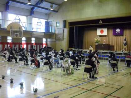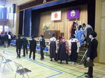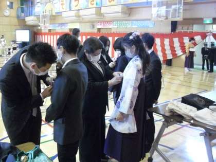 登校した卒業生は、胸花を着けてもらい、最後の朝の会を済ませました。