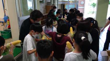 1時間目に給食で使うとうもろこしの皮をむく体験をしました。給食主事さんが用意をしてくれて、貴重な体験をすることができました。とうもろこしのゆで方のコツなども教えてくれました。給食に実際に出てきたとうもろこしを食べながら「自分たちでむいたからおいしく感じる」などと感想をもち、味わって食べている様子が見られました。