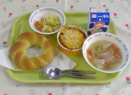 明日葉パン シェパーズパイ コールスロー 野菜スープ 牛乳