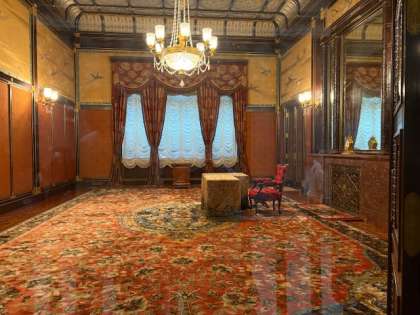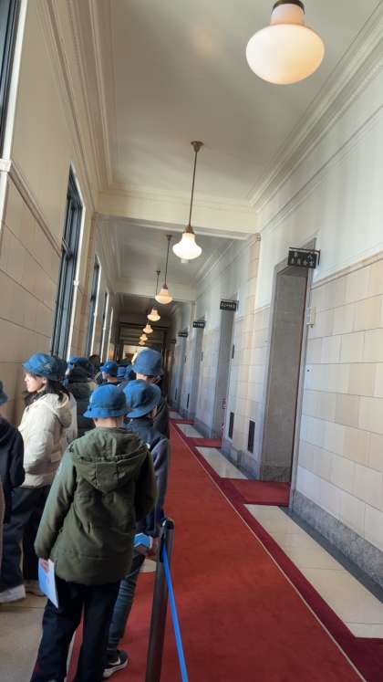 国会中を見学しています。赤い絨毯の廊下を歩き、天皇陛下のお部屋などを見ました。