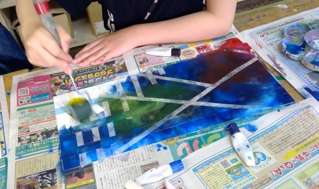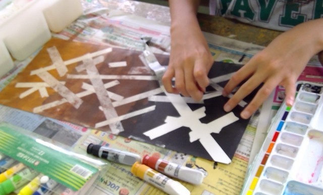 次に絵の具を塗って、マスキングテープをはがすと形が出てきます。